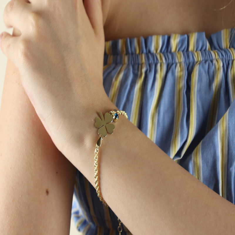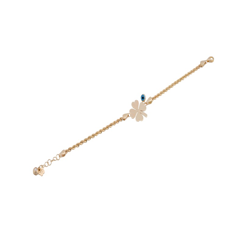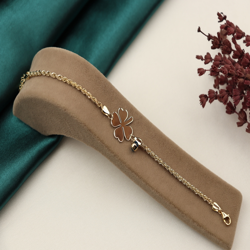 Şıklık ve zarafeti bir araya getiren 14 Ayar Altın Yonca Nazar Boncuklu Bileklik, her anınıza eşlik edecek özel bir tasarıma sahiptir. 4.16 gram ağırlığında olan bu bileklik, 1.7 cm yonca detayı ve 5 mm nazar boncuğu ile göz alıcı bir görünüme sahiptir. 18 cm uzunluğuna ek olarak 2 cm uzatma zinciriyle bileğinize tam uyum sağlar. Altının zarif parlaklığı ve nazar boncuğunun koruyucu etkisiyle günlük ve özel gün kombinlerinizin vazgeçilmezi olacak.
