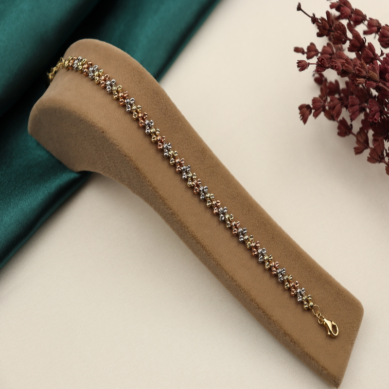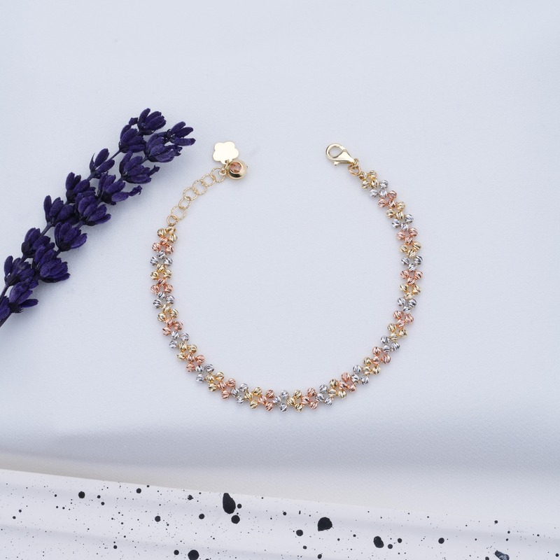 Dorika top ile yapılmış üç renkten oluşan örme bileklik tamamen altın dorika toplardan oluşmaktadır.