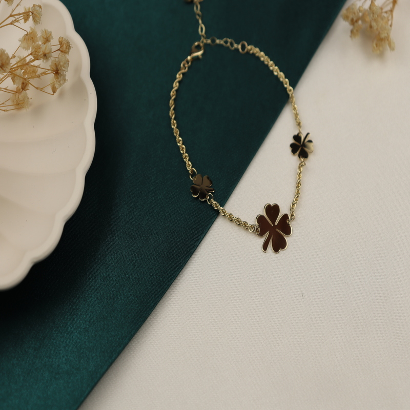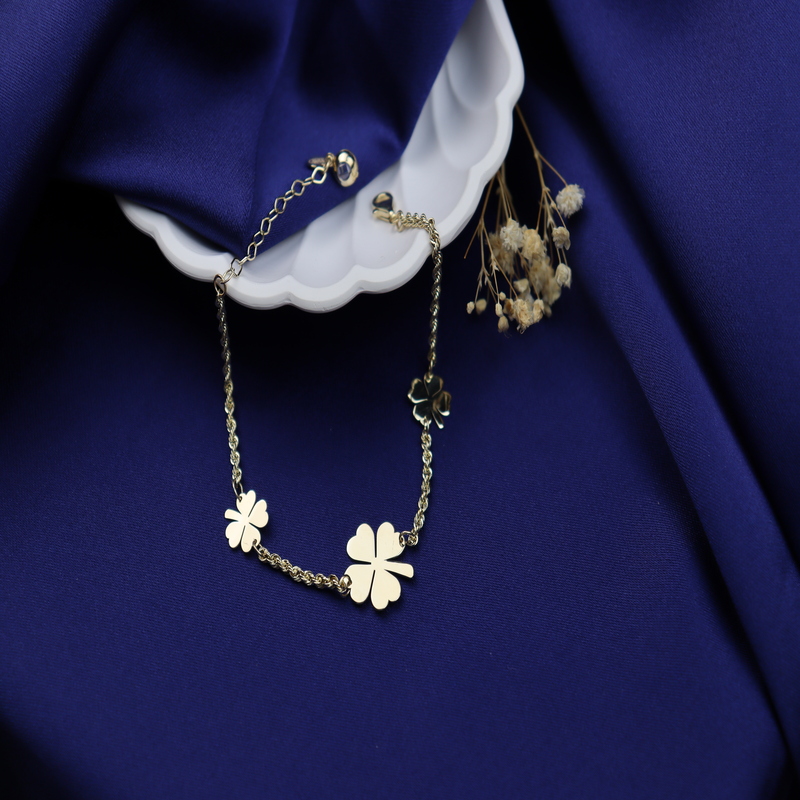 Zarafet ve şıklığın simgesi olan 14 ayar altın yonca bileklik, estetik tasarımı ve anlamlı detaylarıyla dikkat çekiyor. 1 adet 1.5 cm'lik ve 2 adet 1 cm'lik yonca figürleriyle süslenen bu özel bileklik, şans ve bereketin sembolü olarak bileğinizde ışıldayacak. 16 cm uzunluğundaki bileklik, 3 cm uzatma zinciri ile her bileğe uyum sağlayacak şekilde tasarlanmıştır. Günlük kullanıma uygun olan bu şık aksesuar, aynı zamanda sevdiklerinize hediye edebileceğiniz anlamlı bir mücevherdir.
