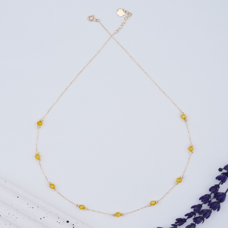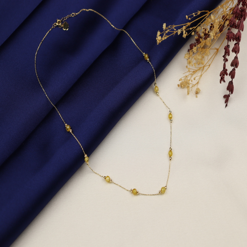 "Şıklığınızı tamamlayacak 14 ayar altın sarı taşlı zincir kolye. 3.38 gram ağırlığında, 43 cm + 3.5 cm uzatma uzunluğuyla her kombine zarafet katacak. Özel 0.20 forse 4 mm taş detayı ve fermuar kilit sistemiyle rahat kullanım sağlar."