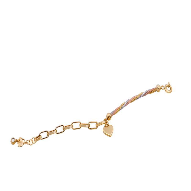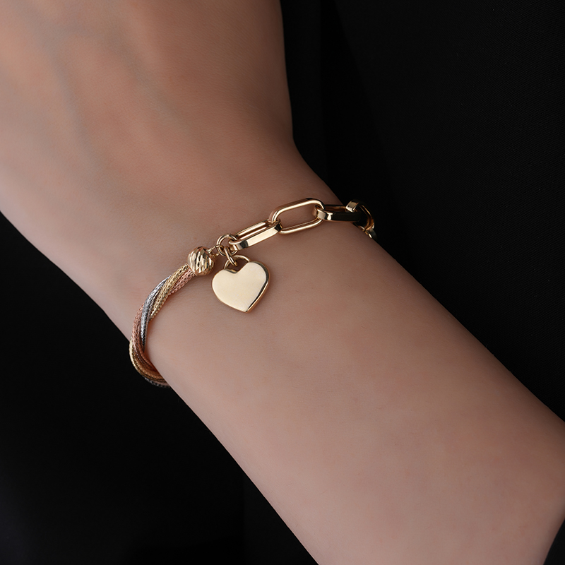 14 Ayar Altın Üç Renkli Zincir Bileklik, modern ve romantik tasarımıyla zarafeti bileğinize taşıyor. Orijinal 14 ayar altın kullanılarak üretilen bu bileklik, 7.05 gram ağırlığı ve kaliteli işçiliğiyle göz kamaştırıyor. Kalp detaylı charm ile sevginin ve şıklığın simgesi olan bu özel tasarım, üç renkli örgü detayları sayesinde hem klasik hem de modern kombinlere uyum sağlar.