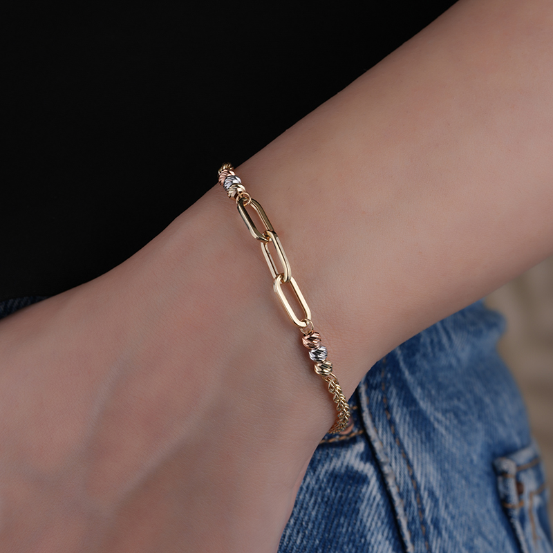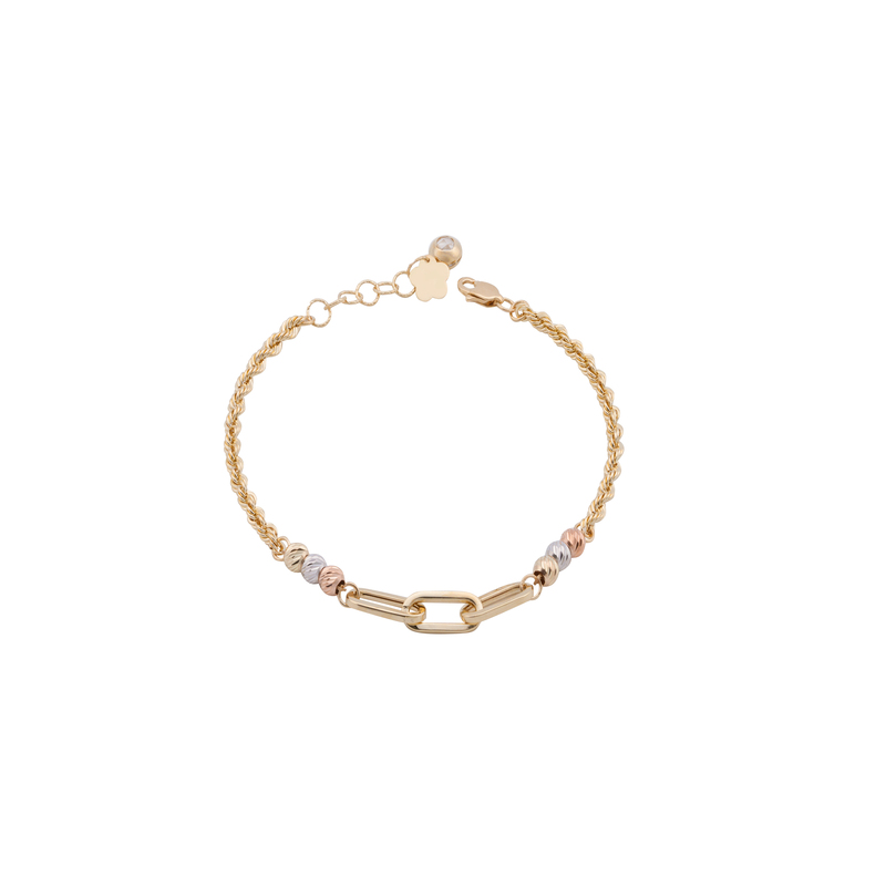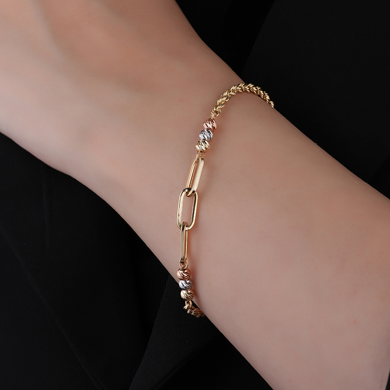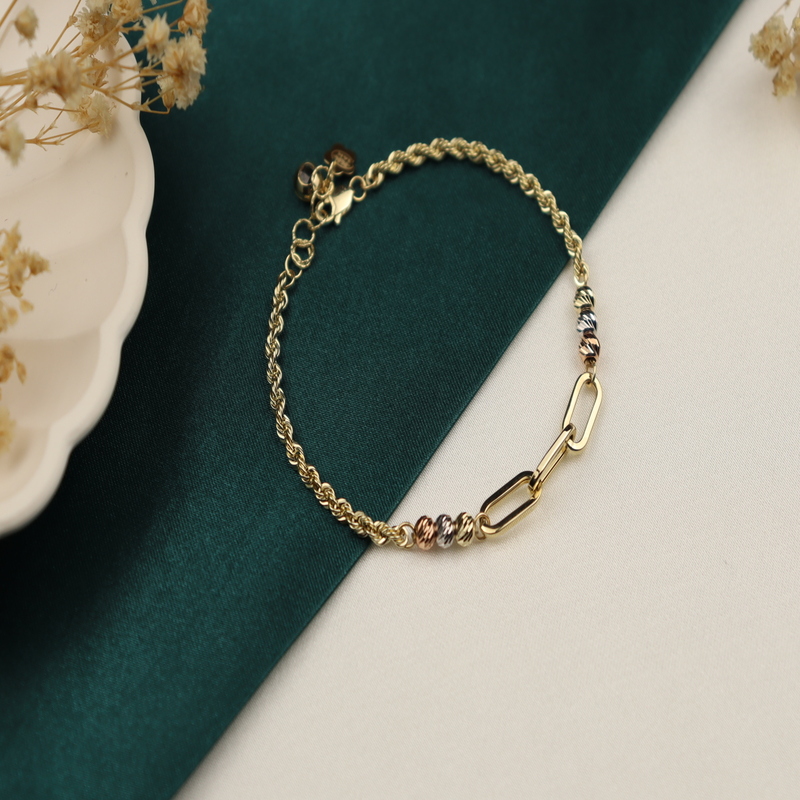 14 ayar altından üretilmiş bu bileklik, halat zincirleri ve şık Tiffany halkaları ile bileğinizde göz alıcı bir ışıltı yaratır.