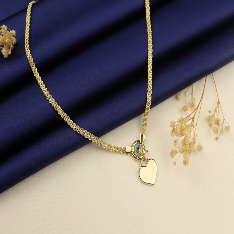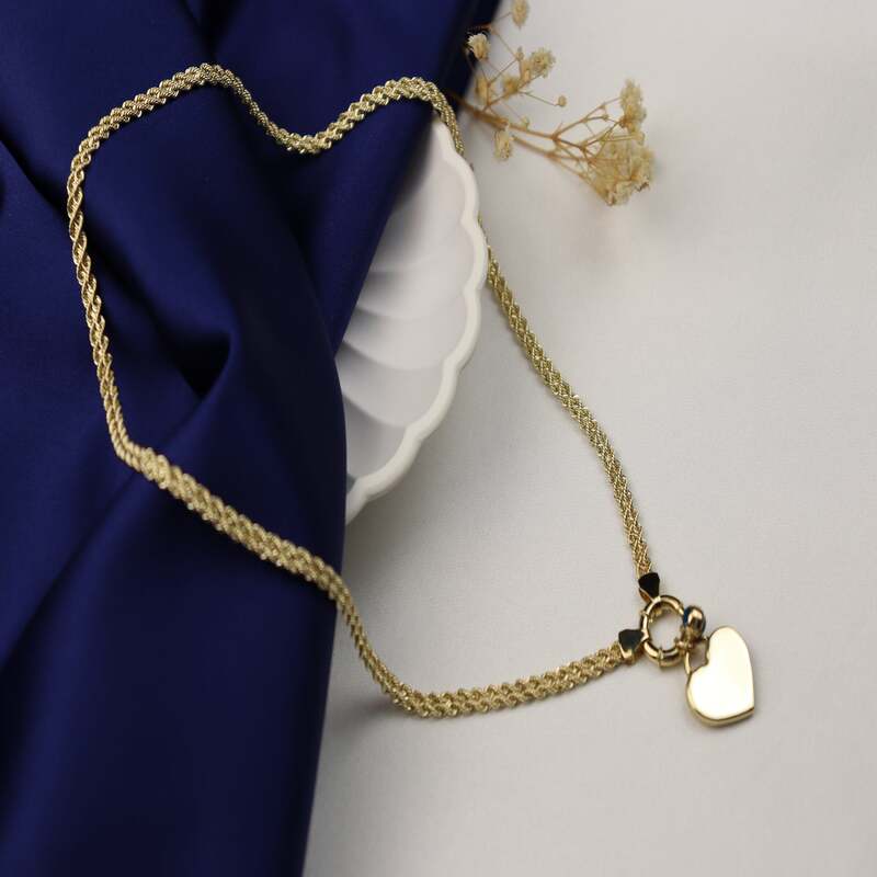 "Zarif ve şık tasarımıyla öne çıkan 14 Ayar Altın Halat Zincir Kalp Kolye, 7.61 gram ağırlığında ve 585 ayar kalitesiyle üretilmiştir. İki sıra kaynaklı, 40 halat dış çapı 2.10 mikron olan kolye, büyük halka göbekteki 100 mikron 450 malafa detayıyla dikkat çeker. 1.70 cm çapında düz kalp detayı ve 43 cm + 2.5 cm uzatma boyu ile her kombine uyum sağlar. Günlük kullanım ve özel günler için ideal bir hediye seçeneği."